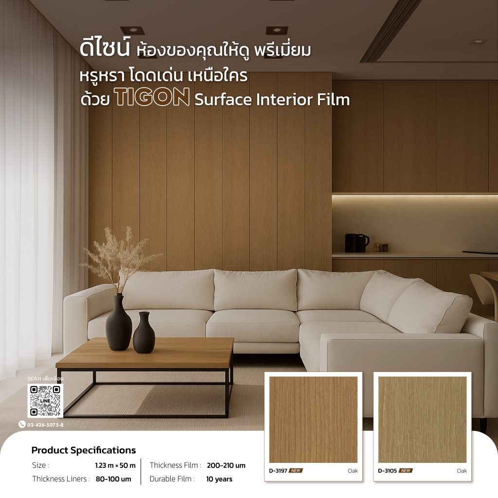 หากคุณกำลังมองหาวิธีรีโนเวทบ้านเก่าให้ดูใหม่ หรืออยากเติมสไตล์อบอุ่นหรูหราให้พื้นที่ในบ้าน TIGON Surface Interior Film คือทางเลือกที่ตอบโจทย์ได้ทั้งในเรื่องของความสวยงาม ความทนทาน และการติดตั้งที่ง่ายดาย ไม่ว่าจะเป็นโปรเจกต์ DIY ด้วยตัวเอง หรือการตกแต่งภายในระดับมืออาชีพ